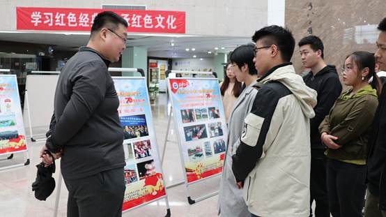 全体党员在图书馆门前集合,在党支部书记薛鹏的带领下有序进入展厅内参观。本次图片展分别回顾了新民主主义革命、社会主义革命与建设、改革开放、中国特色社会主义新时代共四个时期,见证了中国共产党自成立以来,带领中国人民奋起抗争,带领新中国从站起来、到富起来再到如今强起来的光辉历程。前来参观的同志们认真阅览展出图文,悉心聆听讲解,在党支部书记薛鹏声情并茂的讲述下,党员同志们仿佛能听到南昌起义的那一声怒吼,听到新中国成立那一刻的万众欢呼,听到战斗机破空而过的轰鸣。展板上,张贴的照片汇成了一条历史的长河,我们看到第一颗原子弹试爆时的蘑菇云,看到东方红卫星在宇宙中熠熠生辉,看到航母下水战舰列装,看到土坯房变成高楼大厦,看到路桥高架经济攀升……看到我们从一个积贫积弱的农业国成为了工业总量第一的工业大国,成为了举世瞩目的世界第二大经济体。这是辉煌的七十年、壮丽的七十年,在中国共产党的领导下,一切的艰难险阻都是更进一步的垫脚石,无数的奇迹都在这片中华大地上实现。