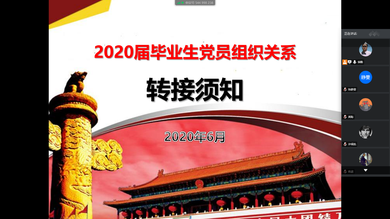 党委于2020年5月31日晚使用腾讯会议APP召开了2020届毕业生组织关系转接动员布置会,会议由院党委组织员薛鹏主持、全体毕业生党员参加。