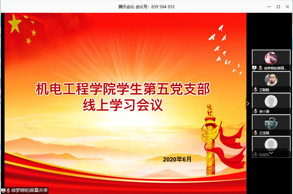 第五党支部于2020年6月26日开展了线上会议,会议围绕“学先进榜样,做优秀党员”展开。内容包括学习“三秦楷模”施秉银、付凡平同志和赵梦桃小组先进事迹及学习“全省优秀共产党员”施秉银、张怡、雷根平和乔锦仁同志先进事迹。本次会议由学生第五党支部书记黄彦军同志主持,由徐梦婷和辛豫婕同志领学。