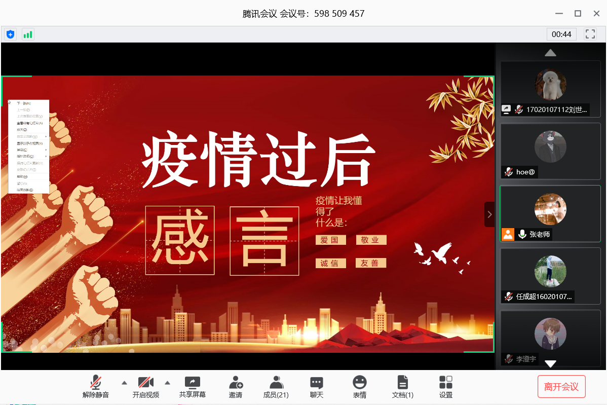 在组织生活会上,支部每位党员讲述此次疫情防控中的身边人身边事,结合自己的生活、学习、工作实际感受战疫中的故事带给自己心灵上的震撼、思想上的升华;作为学生党员,大家都在在疫情期间深受一线英雄事迹鼓舞,严格要求自身,积极投身到抗疫行动中去,充分发挥党员的先锋模范作用。其中,张晓君书记分享了小区党员的“抗疫故事”,表示深受医务人员的抗疫事迹所鼓舞;在疫情关键时期,学院的疫情防控压力大,责任也大,但在成人短剧