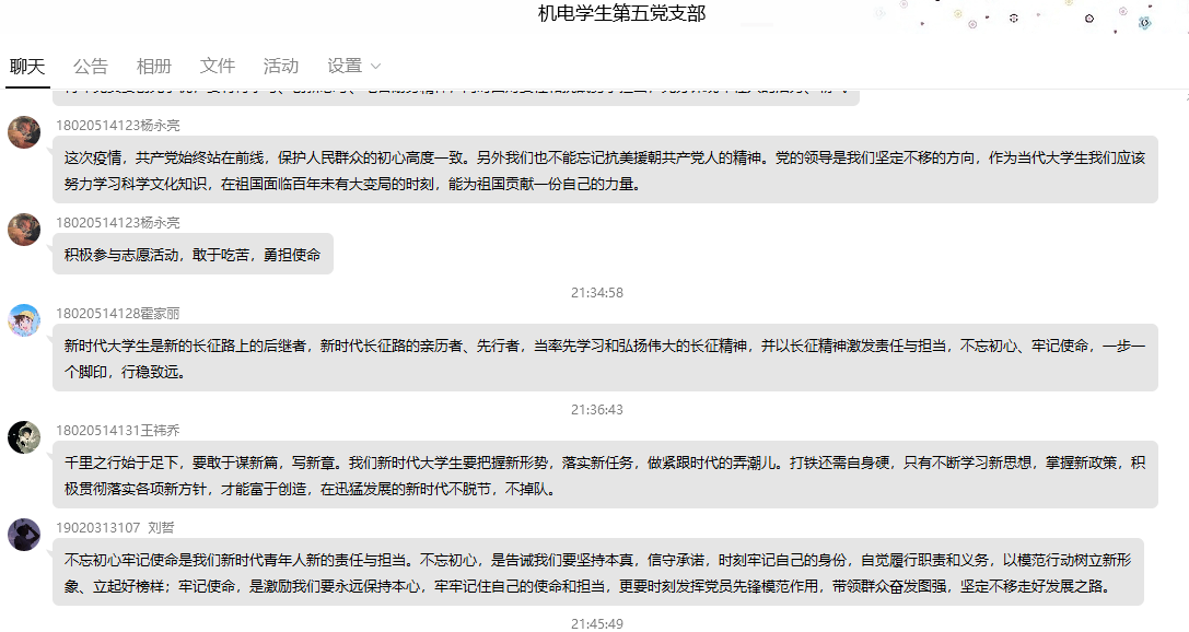 会议第二项,同志们通过仔细阅读内容,在群内共同讨论新时代青年党员的责任与担当。张夏源同志谈到:“有理想,有担当,要不忘初心跟党走,在我国于世界之中的大时代下有自己的担当。学习抗疫工作者无私奉献的精神,继承抗美援朝中艰苦奋斗、一心为国为民的意志”陈帅帅同志表示:“青年党员要创先争优,要有肯学习、创新思考、吃苦耐劳精神,同时面对责任和挑战勇于担当,充分体现年轻人的活力、朝气 ”随后,大家各抒己见,踊跃发言。