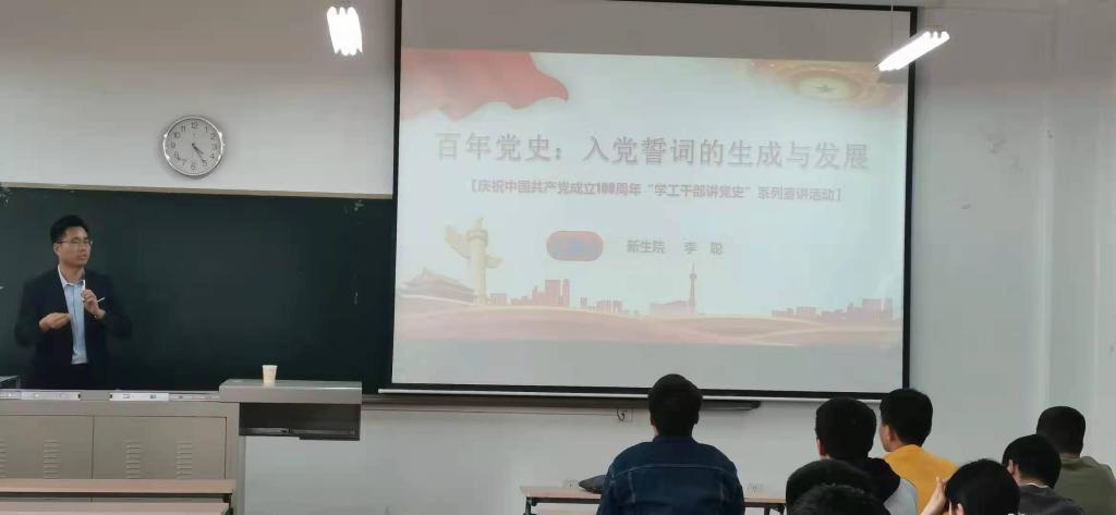 “学工干部讲党史”系列宣讲活动—《入党誓词的生成与发展》,此次讲座邀请新生学院辅导员李聪主讲、研究生第三、四党支部全体党员以及新发展的预备党员参加了本次活动。