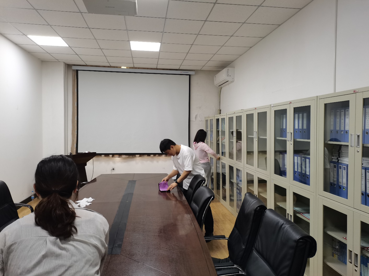 活动开始前,在教2楼3层集合,党支部副书记鲁一妠对活动任务进行了简短的讲解,说明清洁的重点和分工任务,确保每位同志知道自己的职责。活动期间,各党员被分配到不同的会议室进行打扫卫生。大家井然有序,以主动、积极的心态投入到自己所承担的劳动任务中,并仔细地擦拭桌椅表面,清除桌椅上的灰尘和污垢,最后清扫地面垃圾,用拖把拖地,确保环境整洁。在清扫过程中四五人一组分工合作、共同努力,致力于清扫干净每一个角落,不放过任何一处,保障了整个教室环境的干净整洁、为同学们提供了一个良好的学习环境。大家热情洋溢的工作状态,展现了党员积极向上、乐于奉献的精神面貌,充分体现了各党员不怕苦不怕累的优良精神。