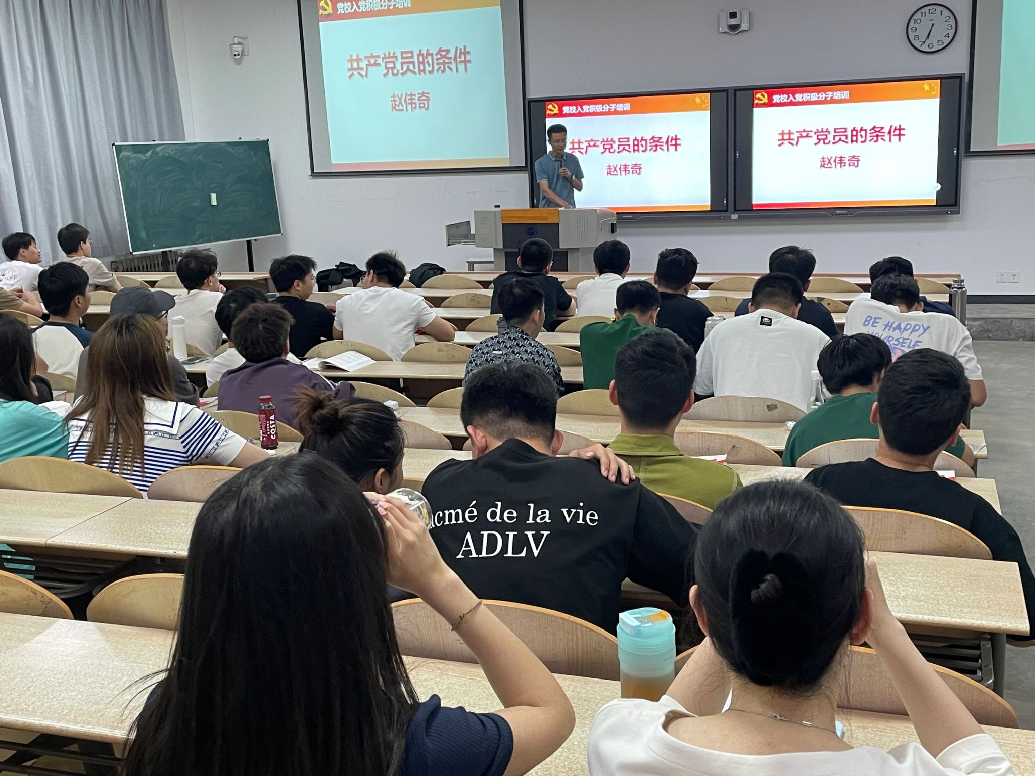 赵伟奇老师从共产党员的条件、共产党员要有政治自觉性、党员发展程序三个方面进行讲述。强调党员是有共产主义觉悟的先锋战士,党员要全心全意为人民服务,党员永远是劳动人民的普通一员。牢记党员的义务,合理使用党员的权利。共产党员要有政治自觉性,坚定不移的贯彻执行党的基本路线,坚定不移的执行党在社会主义初级阶段的基本纲领。鼓励同学们要加强自身的党性教育,提高自己的思想觉悟,争取早日入党,要坚定不移听党话、跟党走,怀抱梦想又脚踏实地,敢想敢为又善作善成,立志做有理想、敢担当、能吃苦、肯奋斗的新时代好青年,积极投身于建设中国特色社会主义现代化强国的事业中去。
