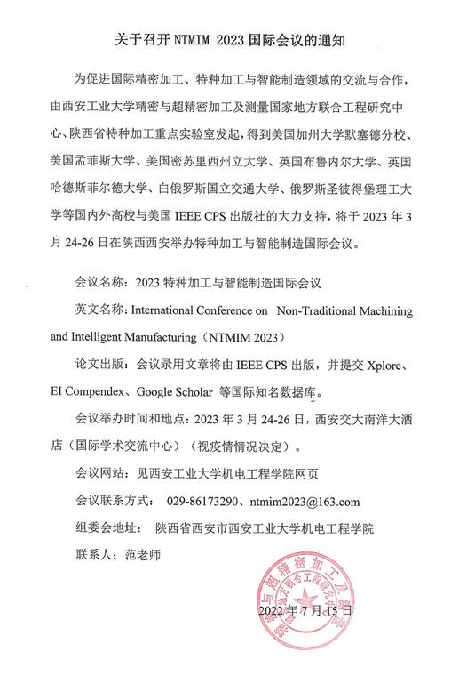 精密与超精密加工及测量国家地方联合工程研究中心、陕西省特种加工重点实验室发起,得到美国加州大学默塞德分校、美国孟菲斯大学、美国密苏里西州立大学、英国布鲁内尔大学、英国哈德斯菲尔德大学等国内外高校的大力支持,将于2023年3月24-26日在陕西西安举办特种加工与智能制造国际会议。