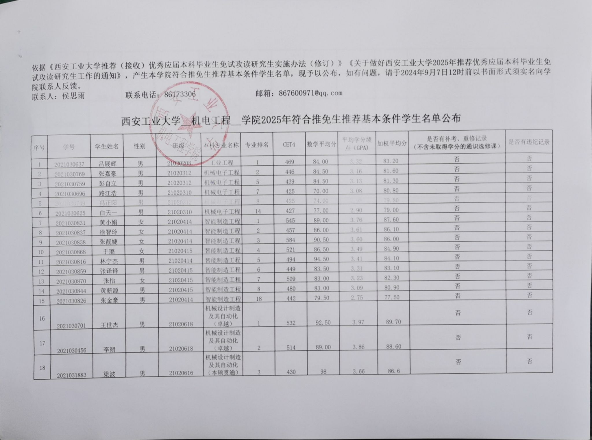 依据《成人短剧 推荐(接收)优秀应届本科毕业生免试攻读研究生实施办法(修订)》《关于做好成人短剧 2025年推荐优秀应届本科毕业生免试攻读研究生工作的通知》,产生本学院符合推免生推荐基本条件学生名单,现予以公布,如有问题,请于2024年9月7日12时前以书面形式须实名向学院联系人反馈。