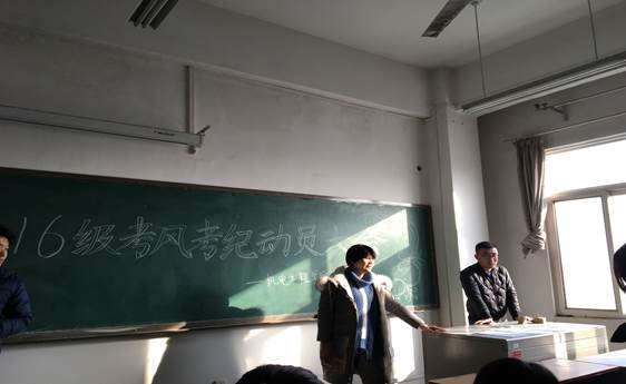 大会初始,由两位主持人宣布大会目的,两位教师也直入主题,首先对即将到来的期末考试相关事项提出要求。老师要求,2016级的班委们要做好领头作用,全身心投入期末复习备考中,做好班级学习氛围及思想工作。对考试作弊、替考、携带手机或其他电子设备进入考场等行为,学校将严惩不贷,班委有义务负责对相关注意事项给予宣传。其次,大会进入第二项,对剩余在校时间的纪律安全做以规范与强调。18周过后2016级基本进入无课阶段,但仍属于教学时间内,学生要严格要求自我,不可放松自我约束,学校的制度规定依旧要牢记,例如,坚决执行请假制度,不能擅自离校等。此外,对即将到来的圣诞节和元旦,全体学生在享受节日欢快的同时,也要注意安全,时刻保护自己,在此期间,有任何突发状况,都应即使联系辅导员,各班做好假期去向统计。最后,两位老师强调,成人短剧