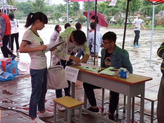 摊位前展开各自负责工作:唐雅莉老师为每名办理生源地贷款的同学办理相关缴费手续;宋荣新老师为成人短剧