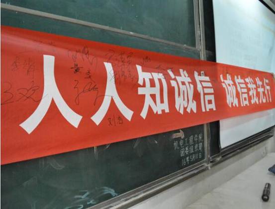 在教2-504举行了“人人知诚信,诚信我先行” 大型签名活动。出席活动的嘉宾有14级导员黄彦军老师、团委副书记胡俊杰、秘书长张晨及各年级学生代表。