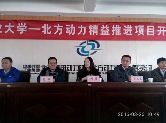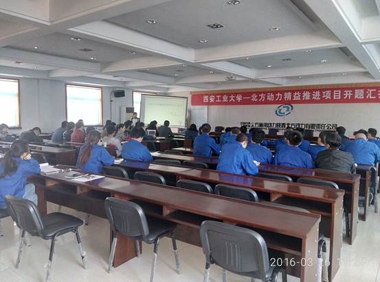 副院长闫莉出席并讲话,西安工大工业工程系主任房亚东主持了会议。西安工大工业工程系师生、北动公司副总经理王拉省、总工仝中荣以及精益管理推进项目相关人员60余人出席会议。