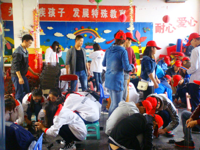 来到心心特幼,在南荣昌部长与心心特幼工作人员的沟通下,志愿者们先帮心心特幼的孩子们做灯笼架,每个人的技艺都由生疏到渐渐熟练。当一把把零散的灯笼材料被做成一个完整的灯笼架时,每个人脸上都洋溢着幸福的笑容,衷心希望红红的灯笼可以给孩子们在即将来临的冬天带去温暖。下午,志愿者们终于见到了可爱的“小天使”――心心特幼的主角们。为了不打扰孩子们的正常生活,志愿者们和孩子们相处的时间很短,时间虽然短暂,但志愿者和孩子们一起聊天、唱歌、做游戏、看动画片,看着孩子们脸上天真无邪的笑容、听着他们爽朗的笑声,志愿者的脸上满满的都是欣慰和幸福。