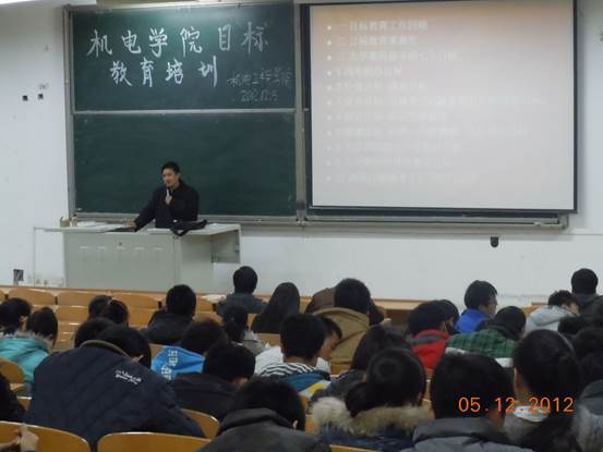目标教育工作回顾、目标教育重要性、大学期间奋斗的七个目标、学院目标教育工作下阶段安排四个方面做了细致精要的讲解。赵书记指出,目标教育包含七个目标,分别是四年的总目标(考研还是就业)、价值目标(人生观、世界观、价值观)、学业目标、职业目标、健康目标(心理、生理、人际关系)、七个技能分目标和体能测试目标。赵书记强调,目标教育至关重要,希望同学们认真写好“大学四年目标规划书”,并根据个人实际情况随时做调整,同时严格要求自己,按计划认真学习,顺利毕业,并最终成为社会需要的人才。