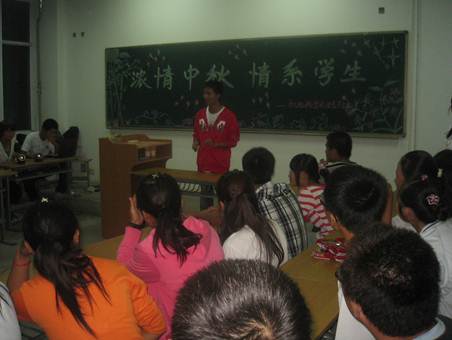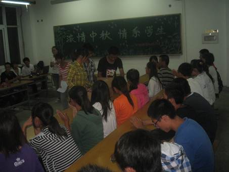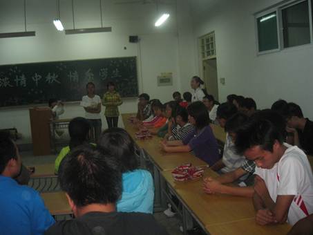 09级辅导员薛鹏、学生处资助中心万超等老师应邀出席本次晚会,并为特困生们送去月饼,让远离家乡的孩子们在愉悦的氛围下度过了一个温暖的中秋晚会。