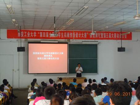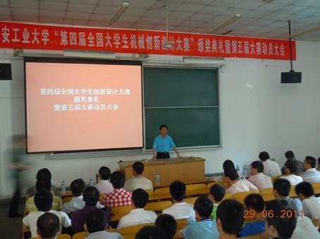 大会开始后,首先由我校“第四届全国大学生机械创新设计大赛”负责人千学明老师作比赛总结。“第四届全国大学生机械创新设计大赛”中,我校共获得陕西省预赛一等奖5项,二等奖3项,三等奖2项,随后“多功能救灾背包”作品更是代表陕西省参加全国决赛,并不负众望地摘取一等奖,从而也使得我校自参赛以来连续两届蝉联一等奖,位居陕西省同类高校前列。千老师在讲话中肯定了我校自参赛以来取得的一系列成绩,同时也指出了不足之处,提出了下一步整改的方向。