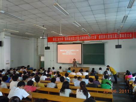 副院长、第五届“全国大学生机械创新设计大赛”陕西省赛区组委会委员刘波教授传达“第五届全国大学生机械创新设计大赛”有关情况。“第五届全国大学生机械创新设计大赛”于2011 年5 月14 日正式启动,其主题为“幸福生活——今天和明天”;内容为“休闲、娱乐机械和家庭用机械的设计和制作”。刘院长说,第五届大赛决赛时间为2012年7月下旬,时间紧,任务重,希望全校有志于参赛的学生和教师争分夺秒,夺取佳绩。