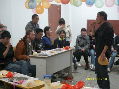在轻松愉快的氛围中,同学们就中美间生活、文化等双方均感兴趣的话题进行了亲切而广泛的交流。稍后,Cale的笑话和白斌同学的歌声更是把整个活动推向了高潮。最终,在活动即将接近尾声时,全体同学还进行了摄影留念,将幸福定格在了这一瞬间。