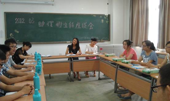 在工2-501召开了12级助理班主任座谈会。学院党委副书记闫莉、辅导员组长姚敏茹、12级辅导员刘静、刘少姗,以及12级十余名助理班主任代表参加了座谈会。