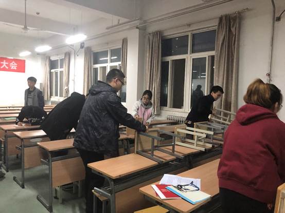 会后,党支部全体党员对会议教室进行了打扫,发挥党员的先锋模范作用,弘扬正能量,用实际行动为学校创建文明校园做出贡献。