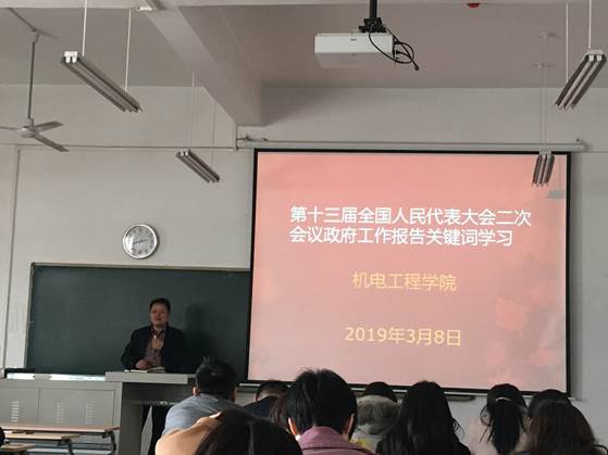 具体情况,对“科技支撑能力”、“打造工业互联网平台”等关键词做了重点解读。最后,赵老师鼓励全体教师充分利用“学习强国”APP了解国家政策、国际国内大事以及治国理政新思想,贯彻落实政府工作报告,加强理论知识的学习,共同助力学院发展。