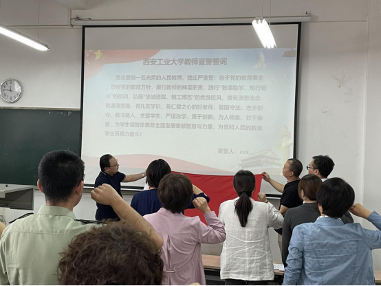 全体教师在工2-504举行宣誓大会,教师面向国旗庄严宣誓,主持由路金龙书记会议。