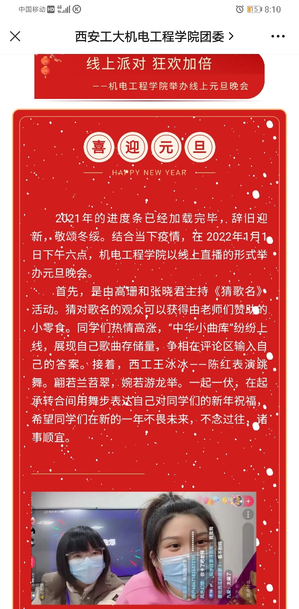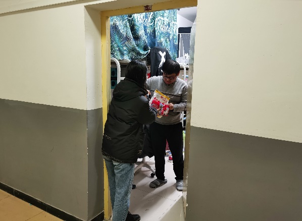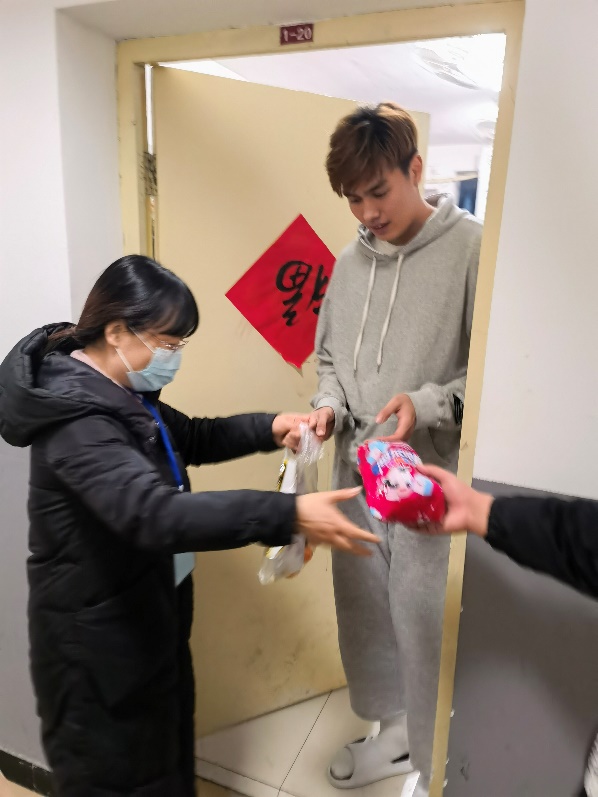 元旦前夕,为了给久居宿舍的同学们营造节日的欢乐气氛,唐雅莉和同事们一起制作了抗疫新年海报,录制新年祝福视频,撰写学院新年贺词,筹备线上跨年直播活动,走进宿舍楼为同学们派发学校精心准备的美味零食和糖果,送上暖心的新年祝福。同学们一句句温暖的感谢和脸上幸福满足的笑容治愈了她,那一刻,她的内心是喜悦的。