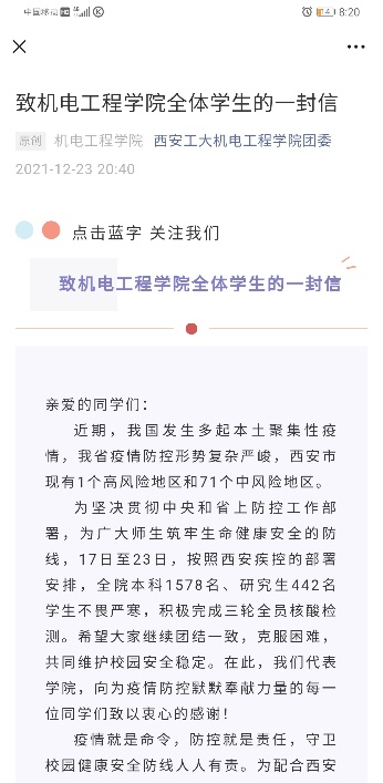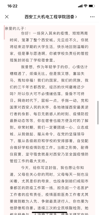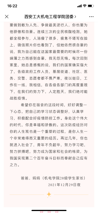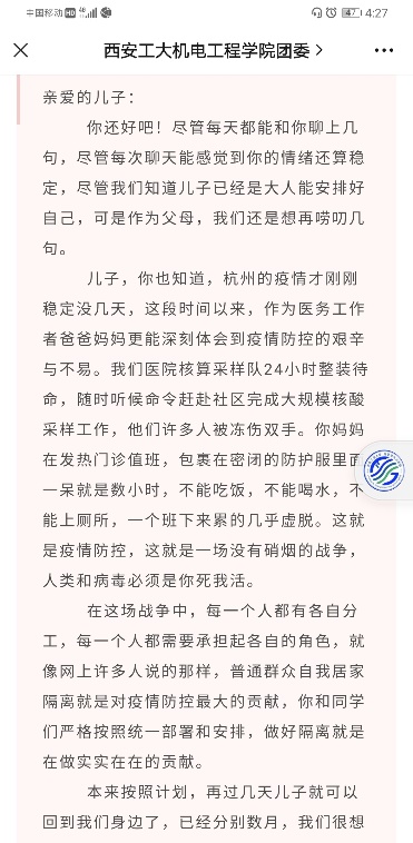 下午唐雅莉去学生宿舍配发完医用口罩,托着疲惫的步伐回到办公室,已是晚就餐时间,刚到手的饭菜来不及吃,匆匆忙忙就跑去餐厅执勤,确保学生有序就餐。路上接到学生家长打来的电话,询问封校管理期间孩子的学习生活情况,她耐心的给家长介绍了学生近况和学校疫情期间的安排,瞬间打消了家长的担心和忧虑。家长挂电话之前连连道谢,说有你们在我就放心了。那一刻,她深切感受到了自己肩上的责任。还有一些家长发来家书,信中写道:了解到你们学校对学生宿舍隔离期间吃饭、购物、洗浴等需求做了合理的安排,许多老师都住到学校公寓,他们丢下爱人、父母、幼子,就是为了保护好你们!作为家长来说我真的无比感动,我们唯一的孩子在被他们庇佑,感恩这一份份静默又无私的付出。儿子你们一定要尊重、理解并支持学校的安排。还没读完家长的信,她的眼角早已湿润,在这场没有硝烟的战争面前,唯有同胞之间的理解和同理心才能让大家团结起来,战胜一切困难。
