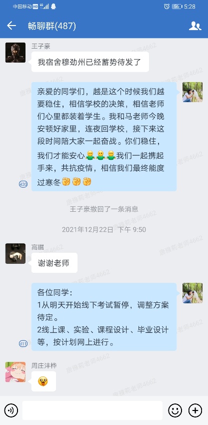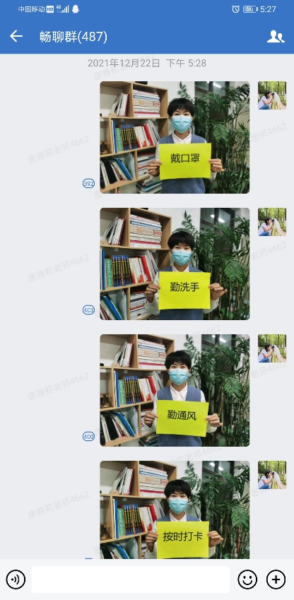 除了核酸检测组、餐厅超市组执勤、九公寓学生包干管理、学院宣传员等专项工作,唐雅莉每天还要管好自己年级480名学生,落实24小时应答机制,耐心解决校园生活中的各种问题:指导新学期线上选课、考试,疏导因疫情引起的心理恐慌,平复因制动管理引起的焦躁情绪,调解封控期宿舍矛盾,为突发疾病学生协调紧急送医,定期配发防疫物资,统计核酸检测信息,督促宿舍通风、垃圾清理,鼓励克服线上学习惰性,组织年级线上文娱互动活动,引导学生规律作息、适当运动、健康生活……每天的工作千头万绪,但每次问到她累不累时,她总是半开玩笑的回答:痛并快乐着,只要学生平安健康,我们学校不失守,一切都值得!