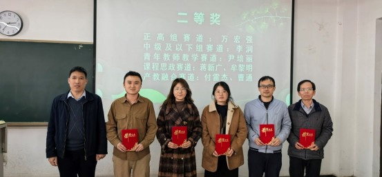 在颁奖环节,首先由院长王洪喜为获奖教师颁发二等奖证书。获奖者包括正高组赛道的万宏强,中级及以下赛道的李润,青年教师教学竞赛赛道的尹培丽,课程思政赛道的蒋新广、牟黎明,以及产教融合赛道的付雷杰、曹通。