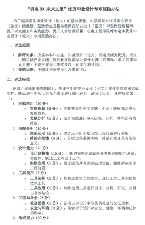 于2025 年特别设立了“未来之星”-机电89级校友毕业设计专项奖励。该奖项由89级机械专业校友基金资助,旨在通过表彰优秀毕业设计作品,彰显校友反哺精神,推动学院创新人才培养。