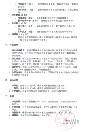 3月下旬,学院发布专项奖励办法,明确评选范围和标准,在满足评选范围的基础上,参评学生的毕业设计(论文)需按学院要求完成归档,随后进一步从文献应用、问题分析、设计能力、工具使用、工程与社会、沟通能力、项目管理、学习能力和创新能力九个维度进行综合评价,结合毕业设计评定分数得出最终排名。
