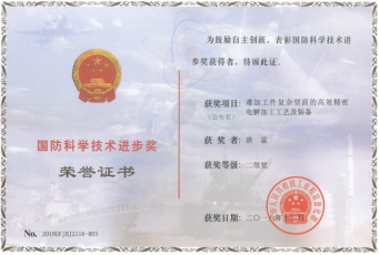 [1]难加工件复杂型面的高效精密电解加工工艺及装备,国防科学技术进步二等奖,2018。