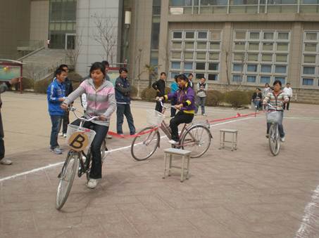 此次大赛共分16个队,每队有4个小组,各小组3个成员,每组3辆自行车。为加大比赛的趣味性和可观赏性,每组的3辆自行车之间还连以红条幅,场上也设以障碍,旨在考察参赛选手的骑车技术,以及小组成员间的协作能力。