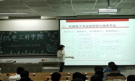 在教2-303举办19级机械电子工程专业介绍会。会议的主讲人为机械电子工程系副主任王丽副教授,辅导员许格宁主持,2019级机电专业新生参与本次会议。
