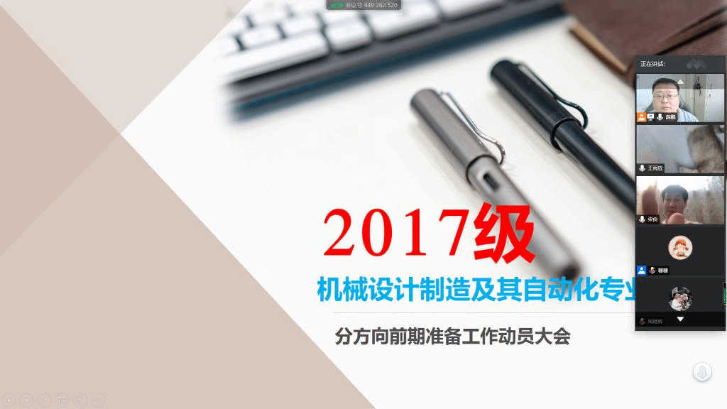 2017级通过腾讯会议系统召集机械设计制造及其自动化专业班长团支书召开关于机制专业分方向前期准备工作动员大会。本次会议由本级辅导员薛鹏主持,全体班长团支书参加。