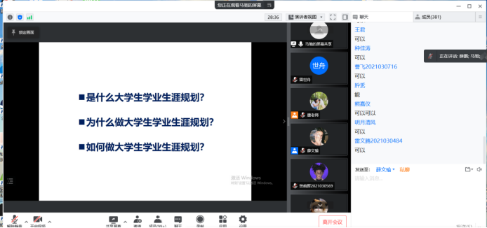 马驰分享的主题为“大学生学业生涯规划”。他从什么是、为什么做、以及如何做大学生学业生涯规划三个方面开展了本次分享,他指出大学生学业生涯规划主要是通过分析自身性格,结合自身兴趣、能力、价值观以及未来社会需要,确定自己的事业目标,进而确定学业发展方向。他通过分析目前大学和社会就业环境的情况,强调了大学生学业规划的意义,并且结合大学各个阶段实际情况为大家做了具体的学业规划分析和指导。