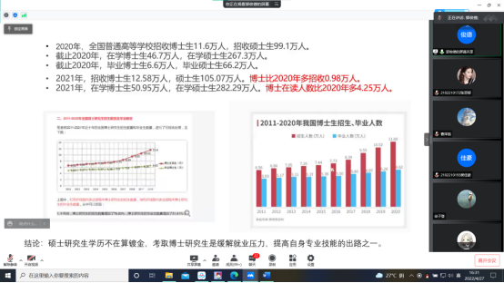 第二阶段,侯思雨向各位同学介绍了博士研究生的申请时间、申请流程、入学时间、以及具体的招生方式;其次,通过对比2020、2021年全国博士研究生在校生、毕业生人数,分析了读博的必要性;最后鼓励在座的同学们一定要树立宏大理想,克难攻坚,提升自己的能力和学历,为着自身更大的发展创造出更好的平台。会议第三阶段,成人短剧