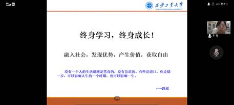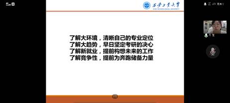 了解考研大环境,清晰自己的专业定位;了解考研大趋势,早日坚定考研的决心;了解新就业,提前构想未来的工作;了解竞争性,提前为奔跑储备力量,以自身的备考经验向我们讲述考研的必要性和重要性。齐老师为大家讲述了2020年诺贝尔化学奖获得者之一的古迪纳夫的故事,这句“我们有些人就像是乌龟,走得慢,一路挣扎,到了而立之年还找不到出路。但走下去呢,也许就有出路了”更是在向我们讲述了学无止境的道理。