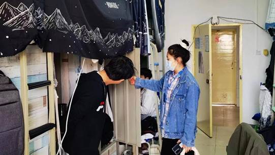 走访过程中,同学们对于领导和辅导员的到来表示真挚的欢迎,纷纷表示一定会从自身做起,严于律己。除此之外,老师们还对宿舍安全、卫生情况进行了检查,总体上,宿舍卫生情况良好,无存在使用违规电器情况。