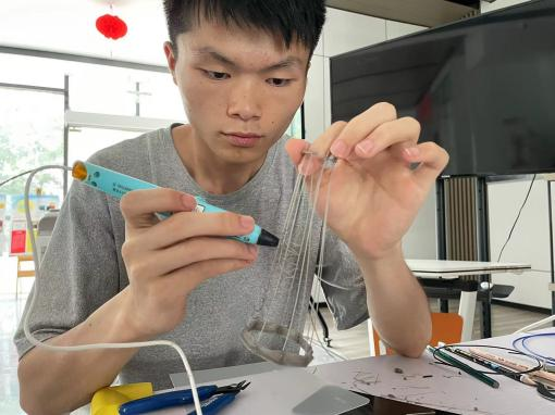 培训结束,课程导师马启文老师带领大家到实践基地进行实地参观,并指导实践队员们分别体验了创意木工、3D打印科普与上色、3D打印笔、编程发报机、北斗导航、编程机器人等项目。实践制作过程中,实践队伍对3D打印、激光内雕等专业知识产生了极大兴趣,并将自身所学运用到创作当中,认真创作。