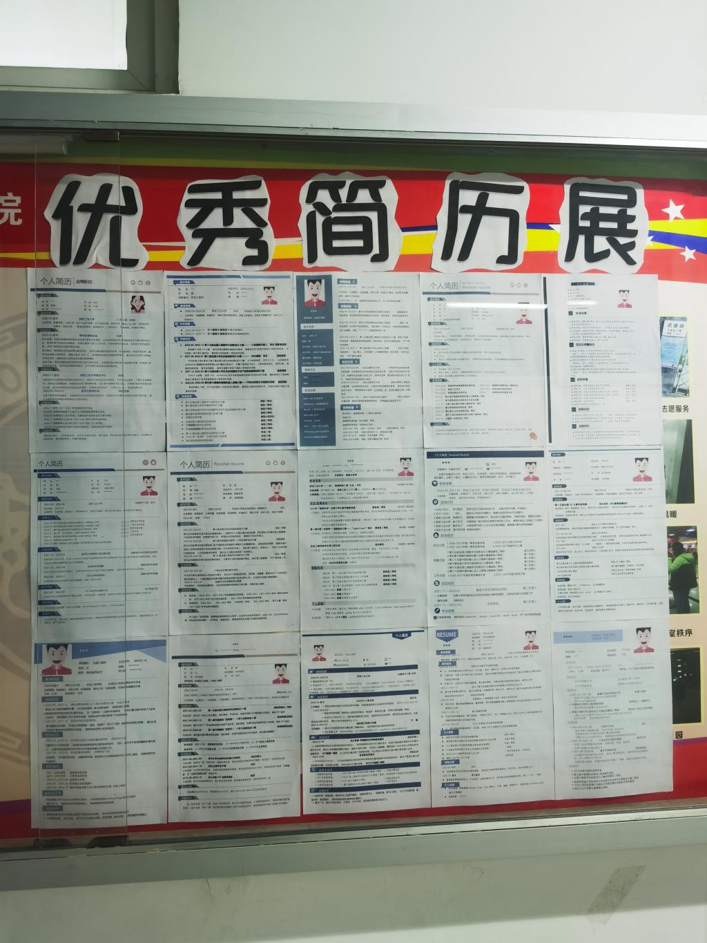 在毕业班开展简历问诊活动,组织辅导员对全体就业学生简历进行一对一修改,并筛选出20余份排版整洁、条理清晰、自我优势突出的优秀简历,张贴在成人短剧