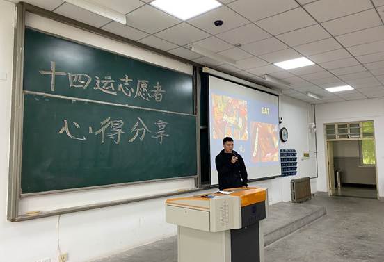首先,吕凯同学向大家介绍了十四运期间的经历,收获和感想,表示这是一次很充实且意义非凡的经历。同时,吕凯同学还介绍了十四运期间的相关工作,例如替运动员及其陪同人员保管身份证、参赛证等个人证件,登记与管控工作以及兴奋剂检查站的日常清理工作等。吕凯同学感慨道在这次经历中不仅体会到了志愿服务的意义,更锻炼到自己的能力。吕凯同学只是我校众多志愿者的其中一位,在十四运的背后还有很多默默奉献的志愿者,他们都为了十四届全运会的顺利落幕贡献出了自己力所能及的一份力量。