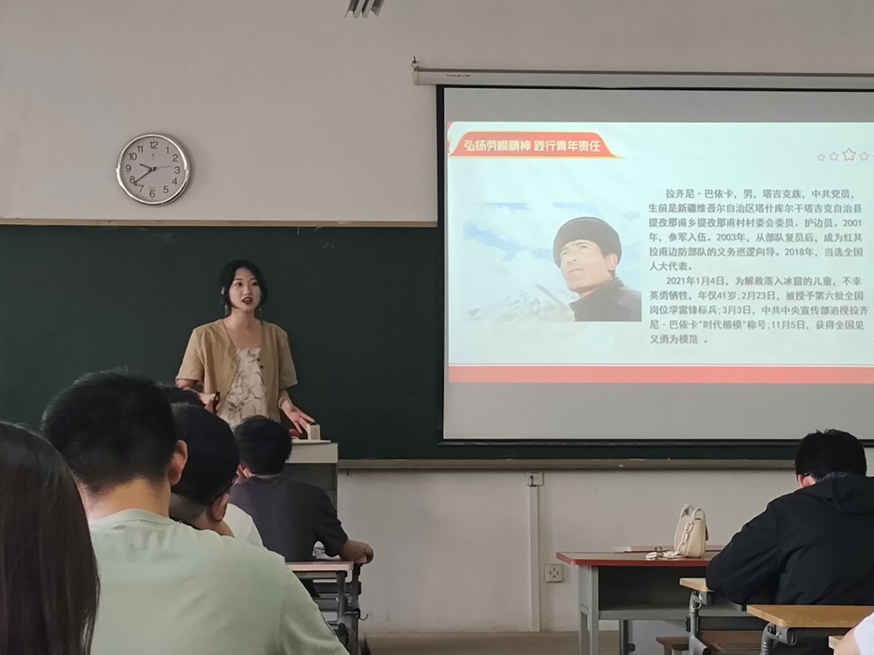 叶嘉怡团课主题为“弘扬劳模精神,践行青年责任”。她从两位劳动模范的事迹出发,向大家宣扬爱岗敬业、争创一流、艰苦奋斗、勇于创新、但伯明了、甘于奉献的劳模精神。最后告诉大家,当代中国青年生逢其时,施展才干的舞台无比广阔,实现梦想的前景无比光明。我们应该将个人投身于社会劳动中,实现自己的人生价值。