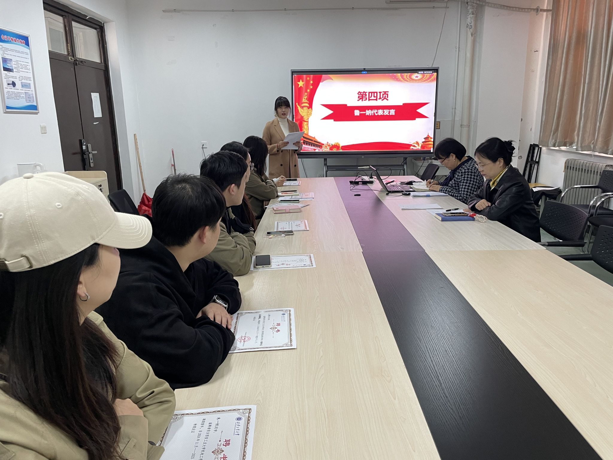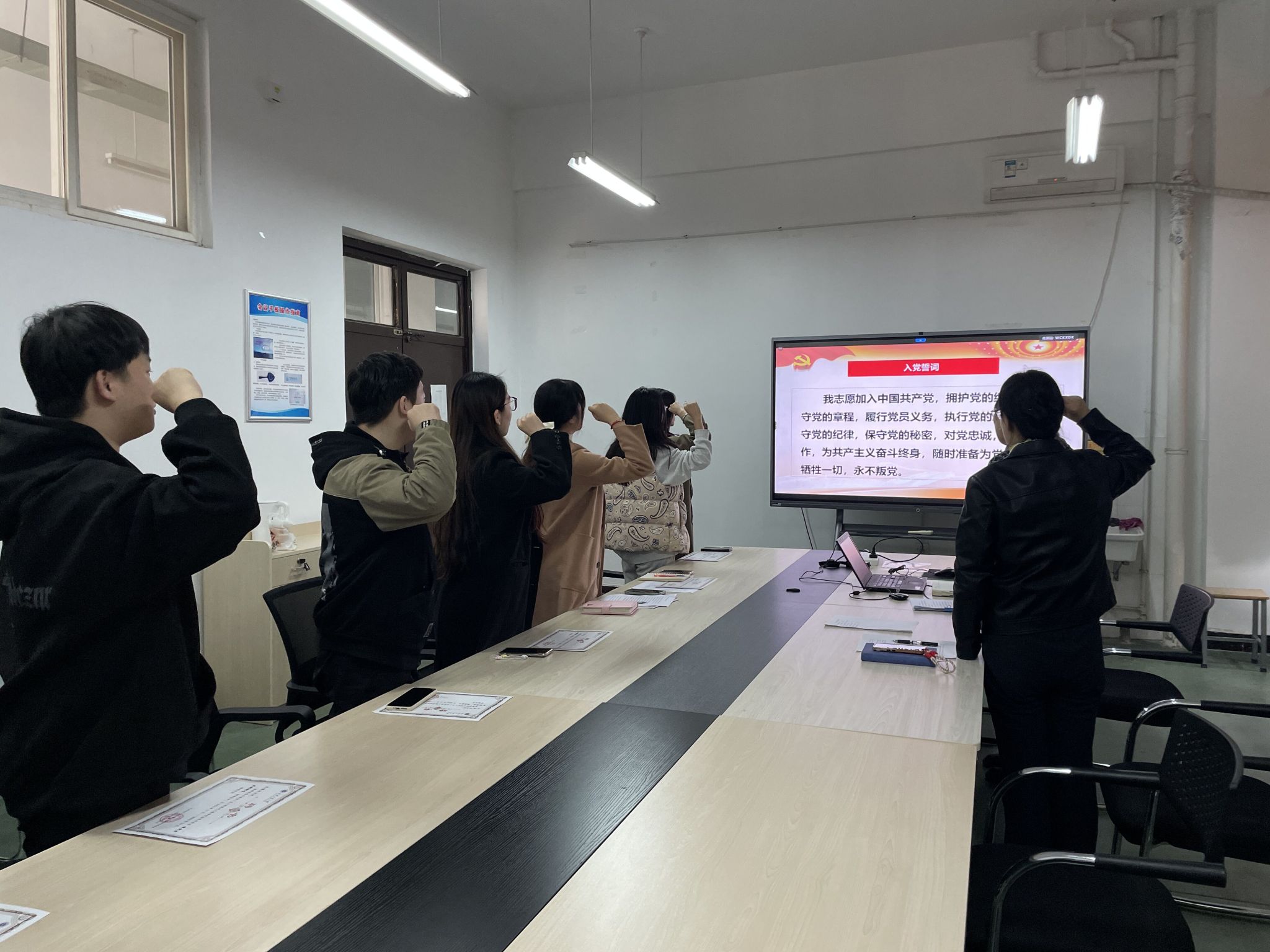 会上姚敏茹、张岩为第一届齿轮共学社骨干成员颁发聘书。与会人员一起重温入党誓词。共学社骨干成员鲁一妠代表发言,她引用了习近平总书记对青年的讲话,强调作为党员,我们肩负着重要的责任,要坚定理想信念,发挥先锋模范作用;在学习和科研中追求卓越,服务同学,传播正能量,增强集体意识,推动团队合作。
